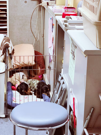 リハーサル&本場中は、事務所の深江さんが飼っているワンチャン用のサークルの中でグーグー。